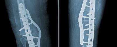 A template was employed to contour an anterior proud 4.5 x 206 mm 11-hole locking plate. The plate was inserted with two screws in the proximal segment and the articulated tensioning device was used to compress the osteotomy site. The construct was bolstered with four proximal and four distal screws. An additional 4.5 x 206 mm medial locking plate was contoured (Figure 3-A).