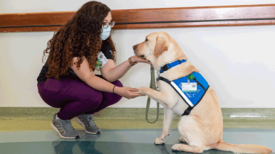 Like other evidence-based child life interventions, facility dogs can benefit kids physiologically and emotionally. “We know that working with animals helps decrease the heart rate and blood pressure,” Miller says. “It can also distract patients from pain and lower their stress and anxiety.”