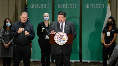 Gov. J.B. Pritzker celebrated progress in the COVID-19 pandemic — including the end of Illinois’ mask mandate — but also called for caution and compassion during a news conference at Rush University Medical Center on Tuesday.