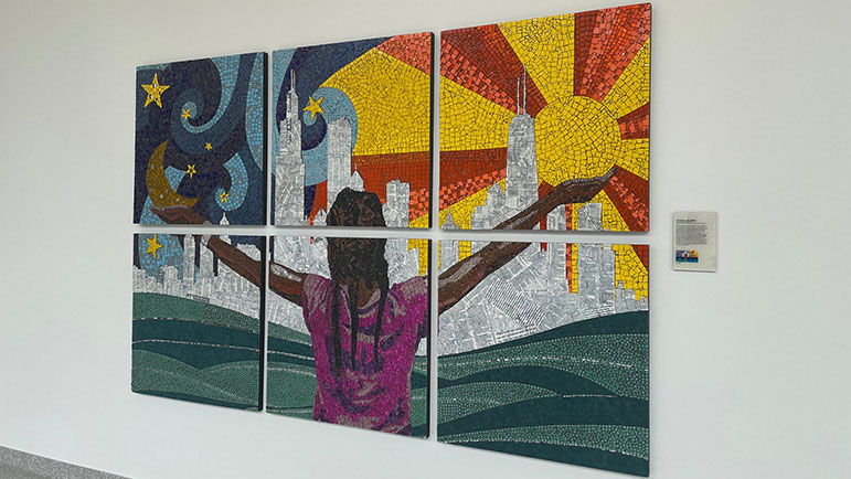 Another notable art installation, “The Sun Also Rises,” was created by RUSH University Children’s Hospital patients and hangs in the south concourse on the first floor. The mosaic, designed with help from Snow City Arts, illustrates the hope in a rising sun over Chicago.