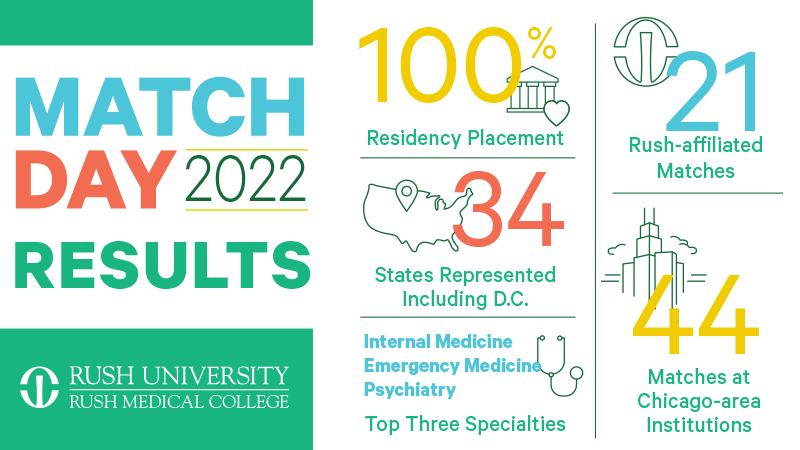 Rush Medical College is pleased to announce that 100% of the Class of 2022 earned residency placement this year. The 145 students matched with residency programs in 21 specialties and combined programs at 88 institutions across the country. This year’s top five specialties were internal medicine (23), emergency medicine (18), psychiatry (15), anesthesiology (14) and family medicine (14).