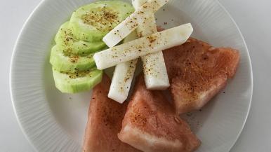 - Place cut jicama, cucumber and watermelon on a cutting board.