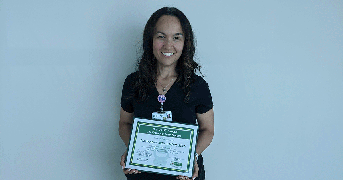 Nurse Tanya Antal, MSN, is the first recipient of the DAISY Award for Extraordinary Nurses given at RUSH Copley Medical Center. The DAISY award is an international recognition program to thank nurses for the “super-human” work they do for patients and families every day.