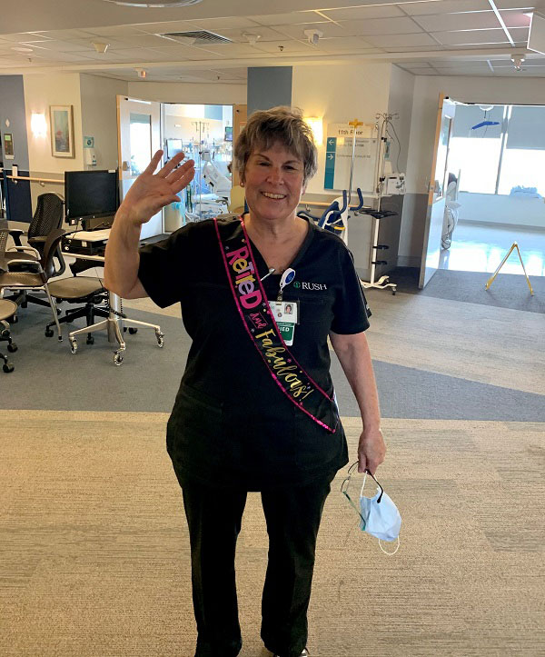 Martha Kuhr, RN, retired from Rush University Medical Center in 2018 and never thought she would return to an intensive care unit, a workplace she had grown to love over the past four decades. But when the COVID-19 pandemic reared its ugly head, she knew her knowledge and skills were needed more than ever.