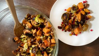 - Once finished roasting, combine sweet potatoes, Brussels sprouts, pecans, cranberries and pomegranates in a large bowl. Mix to combine.