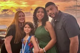Fitha Dahana-Ellis stands on the beach with her husband and two children, who are running in the sand.