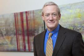 Ron Gidwitz poses for a photo in front of a blurry background.