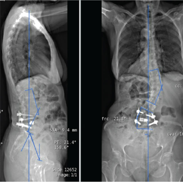 Pre- (A) and post- (B) operative radiographs demonstrating final reconstruction of adult degenerative spinal deformity.