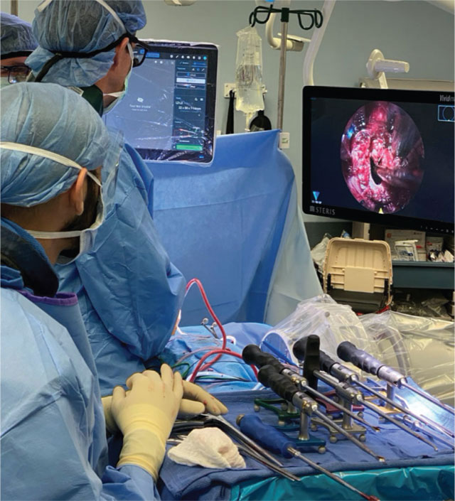 Intraoperative photographs showing the use of the robotic 3D navigation instruments to perform lateral lumbar fusion and deformity correction under endoscopic visualization.