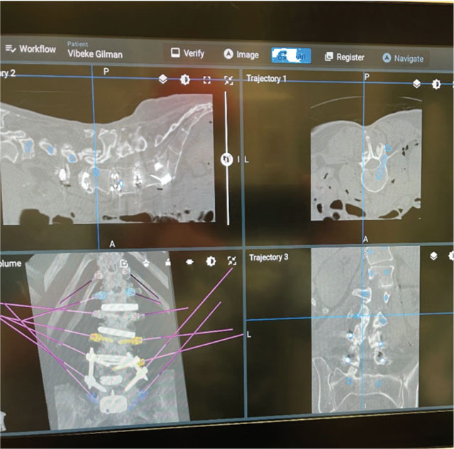 Intraoperative photographs showing the use of the robotic 3D navigation system to plan and place posterior spinal instrumentation for deformity correction.